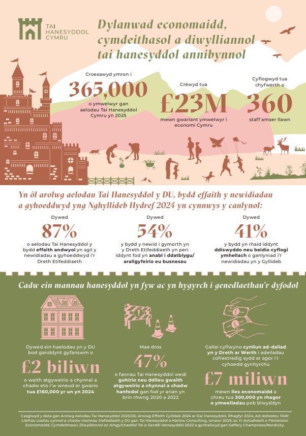 Mae Tai Hanesyddol Cymru yn cynrychioli bron i 100 o dai a gerddi sydd dan berchnogaeth annibynnol ym mhob cwr o Gymru, ac maent yn cynnwys nifer o’r mannau mwyaf eiconig a hanesyddol ein gwlad. Yn 2025 croesawodd aelodau Tai Hanesyddol Cymru dros 365,000 o ymwelwyr, gan gynnal swyddi sy’n gyfwerth â rhagor na 360 o swyddi amser llawn a chreu dros £23 miliwn yn benodol i economi Cymru. Mae llawer o’r mannau hyn yn atyniadau hanfodol bwysig i dwristiaid, yn fusnesau bychain ac yn gyflogwyr lleol yn economïau bregus
